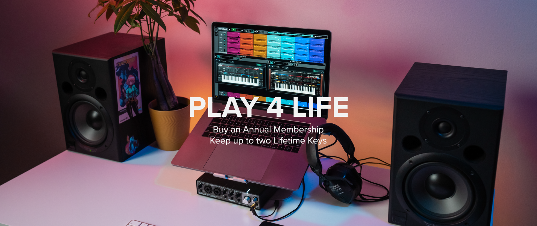 *Promotion Details: This is a limited-time offer that ends December 31, 2025. Play 4 Life requires the purchase of an annual Pro or Ultimate membership to Roland Cloud. At the end of your annual membership, choose one Legendary, AIRA, or SRX Lifetime Key for Pro membership or two Legendary, AIRA, or SRX Lifetime Keys for Ultimate membership. Customers may receive a maximum of ten Legendary/SRX/AIRA instruments for annual Ultimate memberships (two per year) and five for annual Pro memberships (one per year). Promotion Terms & Conditions: JC-120, BOSS FX Pedals, SoundWorks, ZENOLOGY, ZENOLOGY Pro, ZENOLOGY GX, GALAXIAS, RE-201, EARTH Piano, EARTH Electric Piano, JUNO-60 Chorus and Hardware Expansions are all excluded from the Lifetime Key selection. ZENOLOGY Pro Collection Lifetime Key is also excluded from selection. For your selected Lifetime Key use rights, you must maintain an active Roland Account even if you do not renew your Roland Cloud membership. With your Roland Account, you have access to all updates and enhancements for your selected Lifetime Keys. Roland Cloud Manager must be installed, online, and active to retain your membership and Lifetime Key privileges. Roland Cloud Manager and the instruments will periodically connect to the Roland Cloud Server to authenticate authorizations. An internet connection is required. With your Roland Account and Roland Cloud Manager, you maintain access to the selected Lifetime Key(s) for as long as Roland Cloud continues to offer and support that instrument. Roland Cloud reserves the right to periodically assess its catalog selections. Your selected membership and Lifetime Key use rights are not transferable, descendible, or inheritable. Condition: This offer requires payment for a qualified annual Membership. Payment for this offer must be processed for the Lifetime Keys selections to be activated. Refunds: If the subscriber cancels within 14 days, they will receive a full refund and access to the selected Lifetime Keys will be revoked. By participating in this promotion, you agree to all Roland Cloud’s legal policies including: 2025 “Play4Life” Promotion Policy, Privacy Policy, End User License Agreement, and Terms of Use.